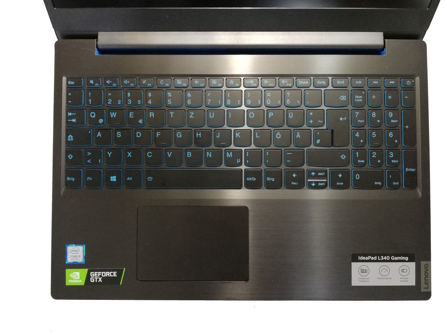 Bàn phím của IdeaPad L340 có hành trình phím ngắn, điểm lực khá rõ ràng. Khi gõ phím, các ngón tay đều có cảm nhận gõ tốt trên bề mặt, tuy nhiên phím mũi tên lên xuống lại quá bé so với các phím khác. Ngoài phần bàn phím số riêng, Lenovo còn trang bị đèn nền bàn phím một màu (chiếc máy mình đang dùng có là màu xanh). Độ sáng đèn nền tốt, có thể điều chỉnh 2 mức độ.