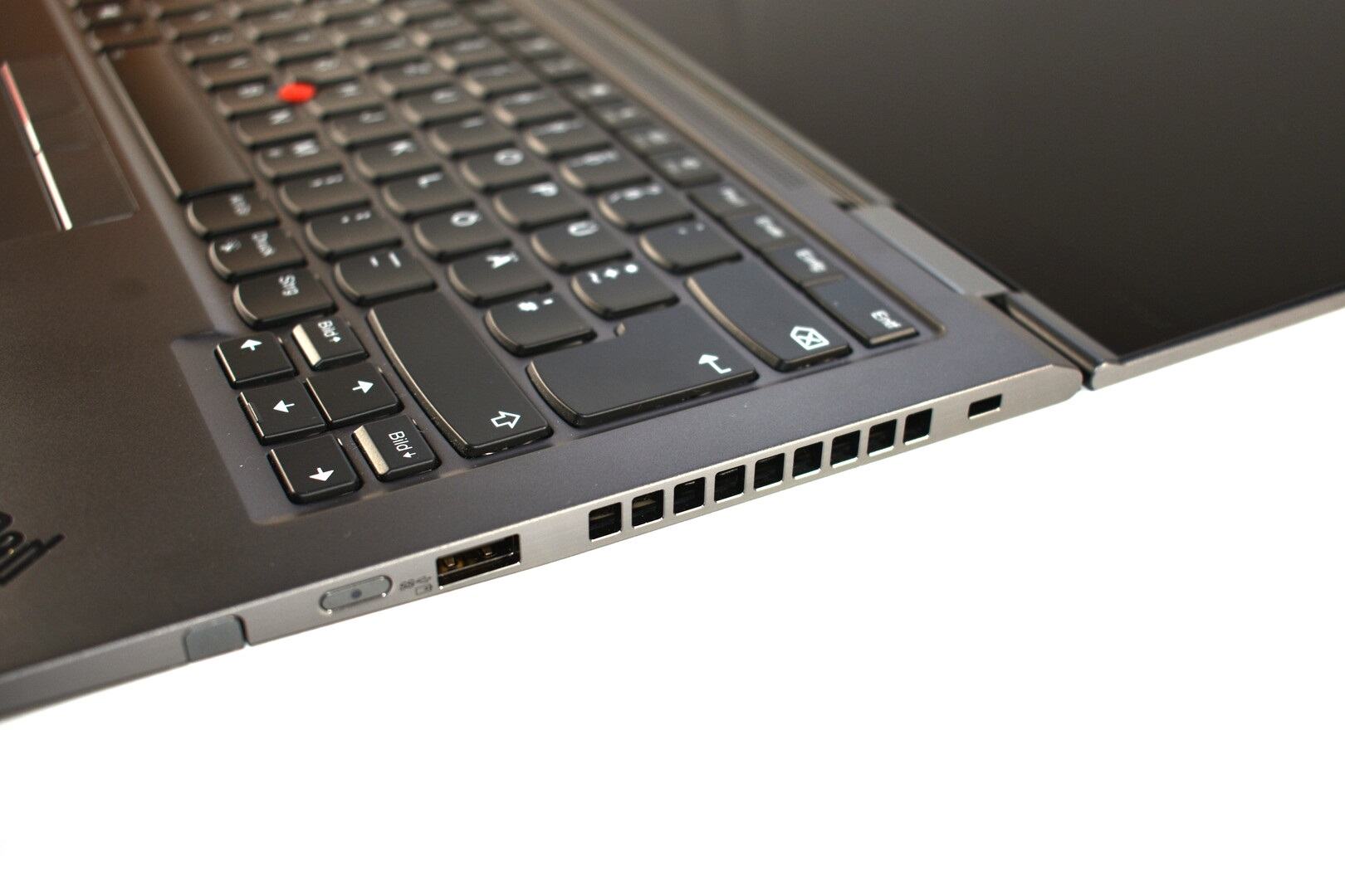 Vị trí các cổng kết nối cũng được thay đổi, chủ yếu bởi vì Lenovo lại đặt khe tản nhiệt sang phía cạnh phải. Kết quả là gần như tất cả cổng kết nối đều nằm bên trái, chỉ có một cổng USB A ở bên phải thôi. Khi đó, tay phải dùng chuột của bạn sẽ được sưởi ấm nhờ khe tản nhiệt.
